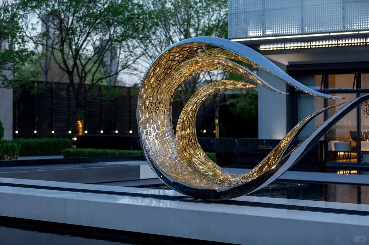 This unique glow-in-the-dark abstract sculpture, with its graceful curves and delicate mesh structure, is a perfect blend of modern art and high-tech lighting technology. During the day, its metal surface glistens in the sunlight, displaying a unique texture and beauty; at night, its internal lighting system is automatically turned on, emitting a soft and fascinating glow through the delicate mesh structure, as if it were a radiant band of light that lights up the surrounding environment. The sculpture is suitable for high-end communities, luxury hotels or public art spaces, which not only enhances the artistic atmosphere of the place, but also brings visual enjoyment and peace of mind. This abstract sculpture is a perfect combination of modern design and functionality, which can be a bright landscape during the day or at night, bringing people unlimited reverie and enjoyment of beauty.