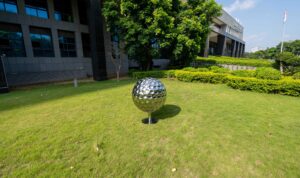 This unique golf ball sculpture, situated in a lush green city park, is a perfect combination of modern art and sportsmanship. The sculpture presents a huge silver golf ball with a smooth and grooved surface, as if it were a real golf ball enlarged countless times. Its exquisite design and craftsmanship demonstrates the sculptor’s ultimate pursuit of detail.