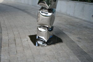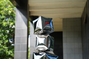 This image shows a contemporary outdoor sculpture featuring a vertical stack of reflective, metallic cubes. Each cube has slightly concave and convex surfaces, creating a dynamic play of light and reflections from the surrounding environment — including greenery, modern architecture, and the sky. The sculpture stands on a paved area near a sleek, glass-covered building, giving it a striking contrast between natural and urban elements. The mirror-like surface of the sculpture invites viewers to engage with their surroundings through distorted reflections, embodying a sense of balance, modernity, and transformation.
