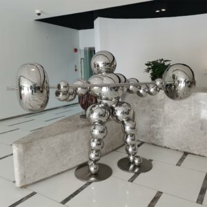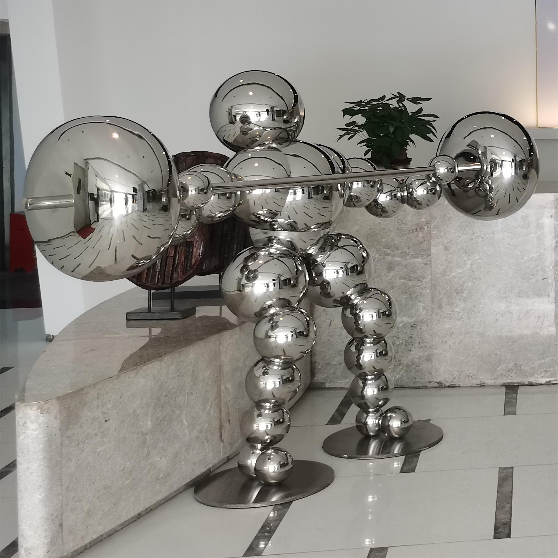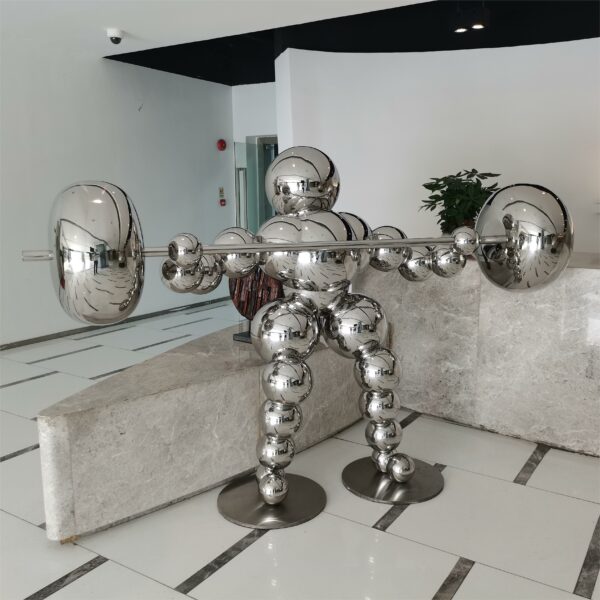 This sculpture is cleverly composed of multiple spheres, vividly showing a strong figure undergoing a weight lifting challenge. The muscular lines formed by the spheres and the lifting posture depict the force and challenge in the sculpture.