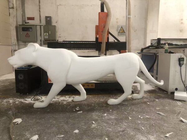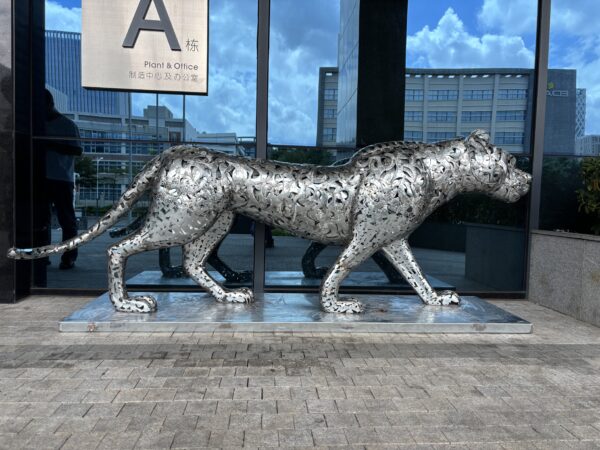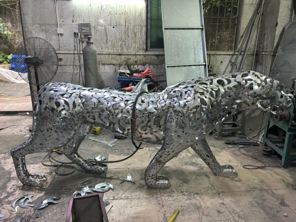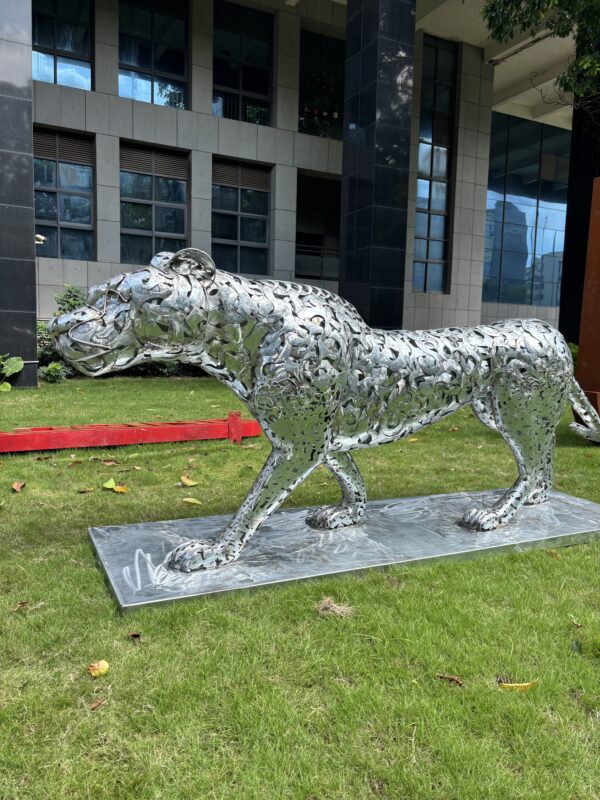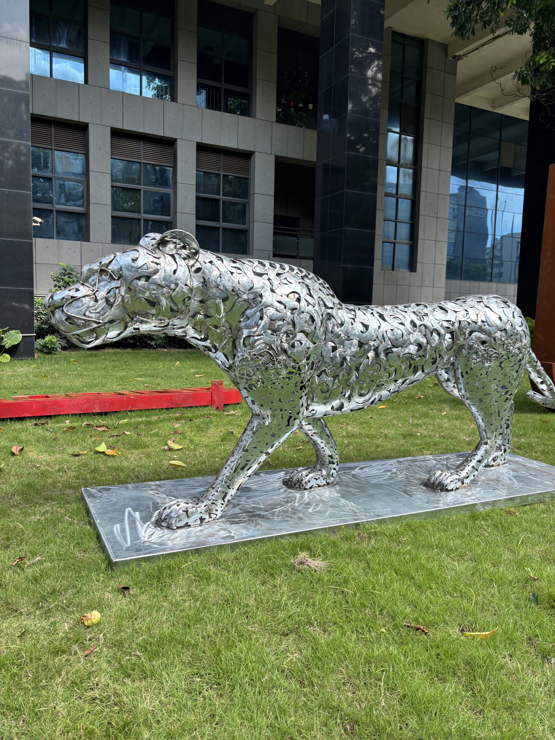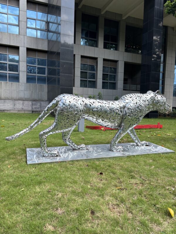 stainless steel sculpture, metal art, leopard sculpture, modern design, outdoor installation.