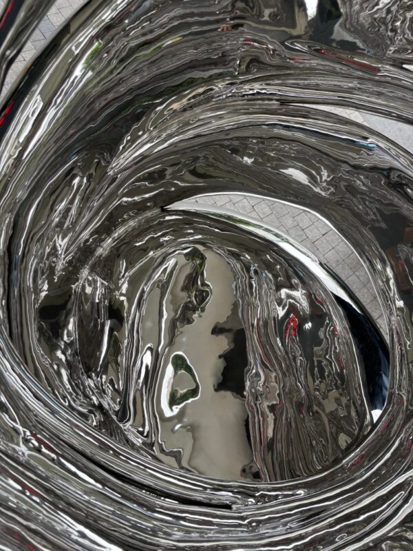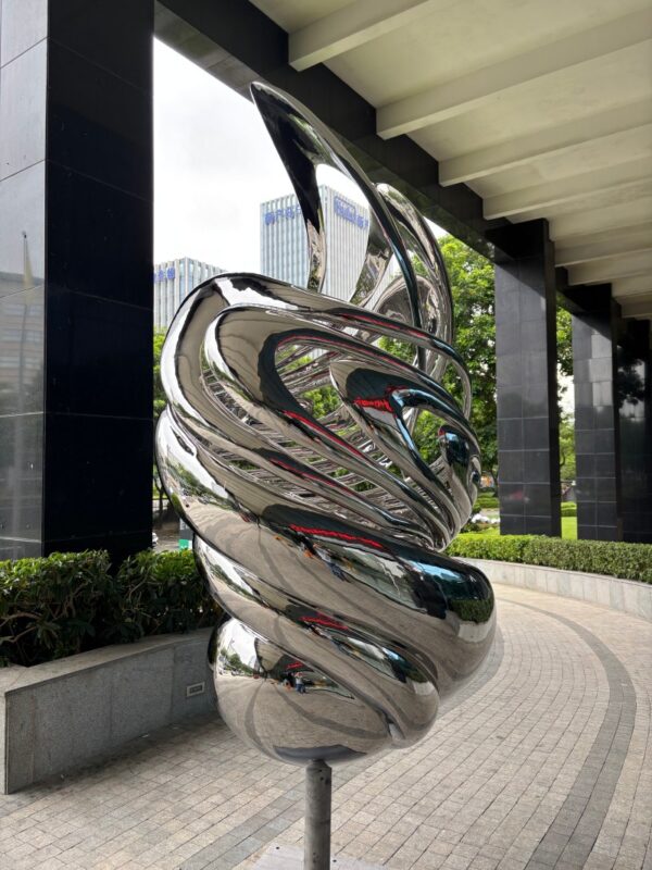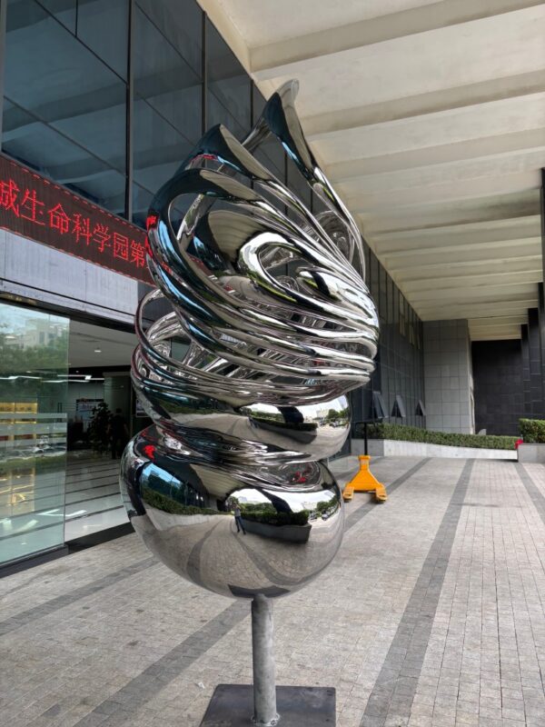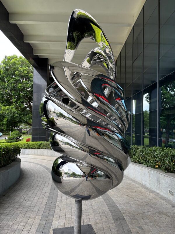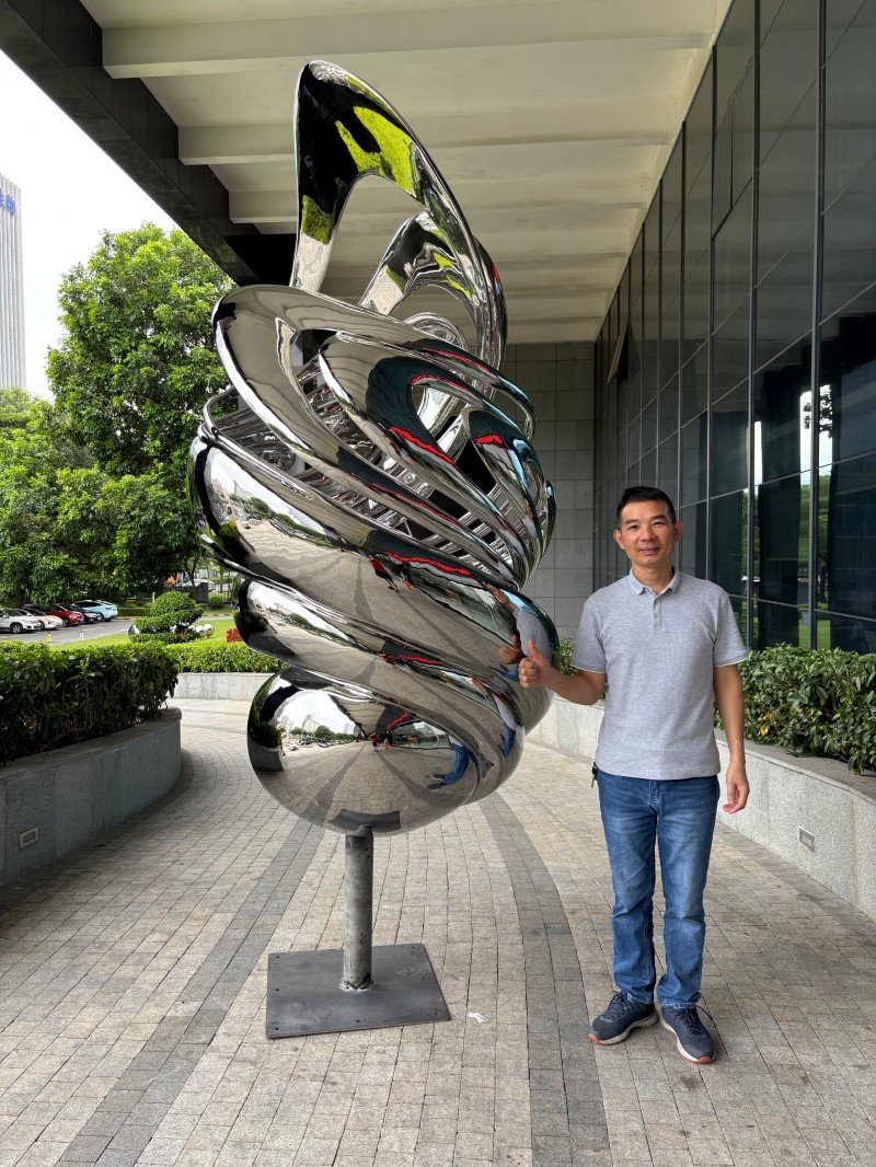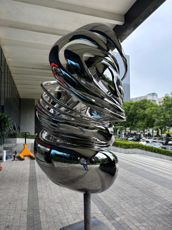 Crafted from 304 stainless steel, its mirror-polished surface captures the world around it—the shifting colors of the sky, the rhythm of passing clouds, the greenery nearby, and even the movement of people who stop to admire it. The sculpture never looks the same twice; it transforms throughout the day, reflecting the life and energy of its surroundings.
